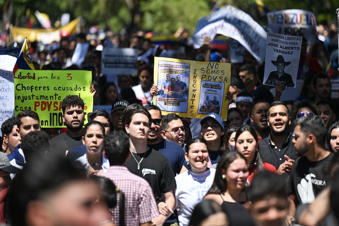Estudiantes universitarios, opositores al gobierno y familiares de presos políticos participan en una marcha con motivo del Día de la Juventud en Caracas, el 12 de febrero de 2026. AFP/NI